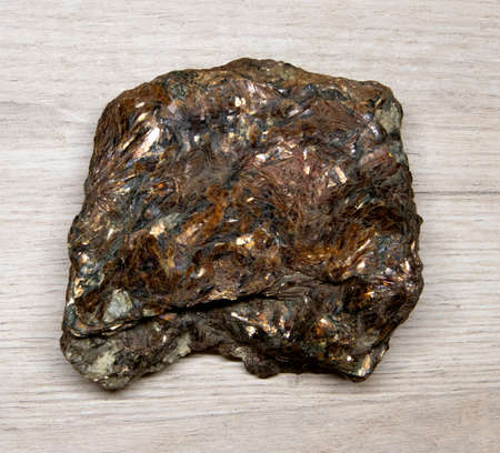 Large piece of shiny faceted mineral feldspar lying on a wooden surface