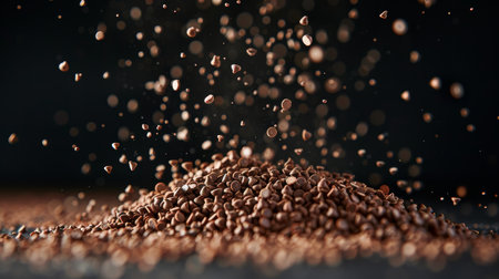 A captivating image of roasted grains flowing into a polished metal bowl, highlighting the rich textures and colors. Perfect for food-related themes.