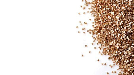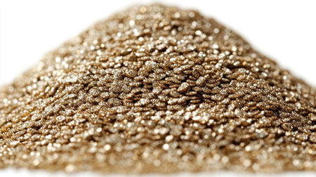 A pile of gold glitter scattered on a white background.