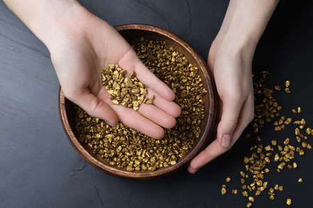 Woman with gold nuggets at black table, top view
