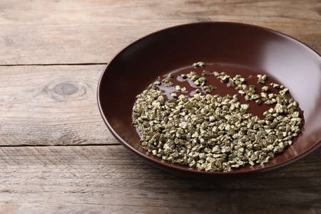 Plate of gold nuggets on wooden table. Space for text