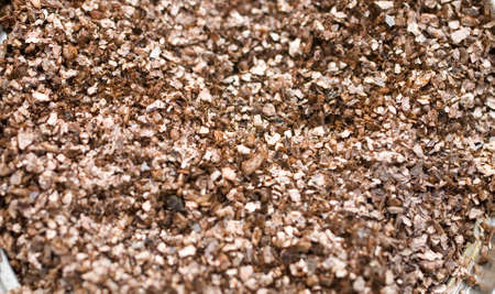 Close-up scene of the broken chip of brass materials scrap from turning process. The pile of broken chip from turning machine