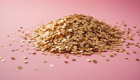 pile of golden glitter on pink background, shallow dof.