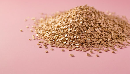 Heap of golden buckwheat flakes on pink background, closeup