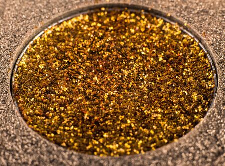 festive eye shadow in gold color in a shiny package, macro