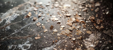 Rare earth mineral flakes scattered across a dark marble countertop, highlighted by soft lighting. the image emphasizes the unique textures and subtle color variations, creating a sophisticated backdrop ideal for design inspirations.