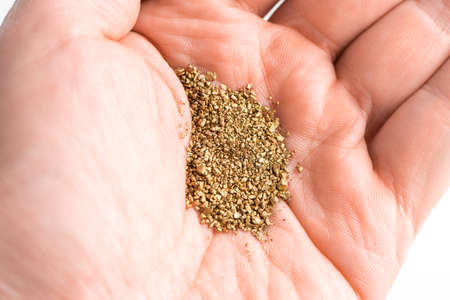 Vermiculite in the hands of a man. A mixture of earth, perlite and vermiculite. The concept of growing medical cannabis in the doore indoor. Substrate for marijuana. Close up. Soil growing cannabis.