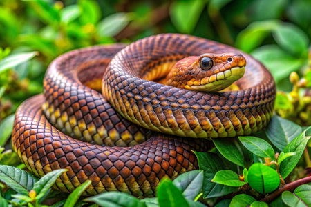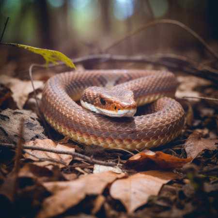 A brown snake lies quietly among the leaves showcasing its detailed scales and keen eyes under natural lighting in a serene environment.