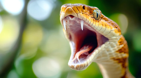 A snake displays its fierce teeth as it prepares to attack, surrounded by a softly blurred, natural background that enhances its striking features.