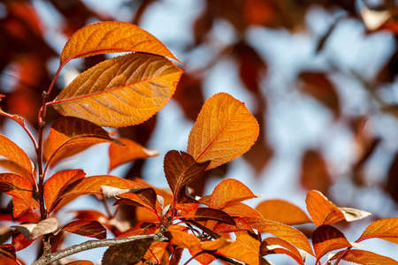 Pruno leaves, against the light in autumn. Reddish leaves of a fake cherry tree.