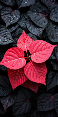 Red poinsettia leaves on dark background, closeup.