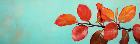 Vivid red leaves with subtle orange veins emerge on slender branches, creating a striking contrast against a soft turquoise backdrop during early autumn days.