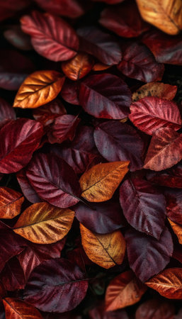 Close-up of vibrant autumn leaves in rich burgundy and gold tones. A captivating autumnal scene showing nature's beauty.