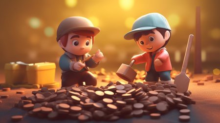 Engineering worker digging and working with coin as business and indurstry concept. Figure or miniature with gold, silver, bronze coin as work hard for money idea