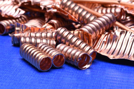 Of scrap copper for recycling on blue background, copy space