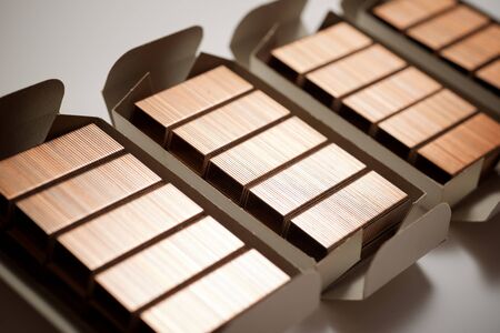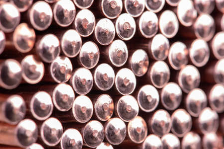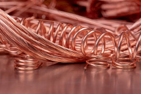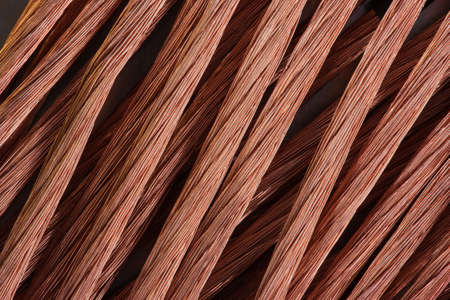 Cut copper wire closeup, component of metal and energy industry
