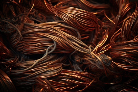 Close up of a dense. Jumbled pile of intertwined. Oxidized. And twisted copper wires - a metallic texture background representing the recycling. Repurposing