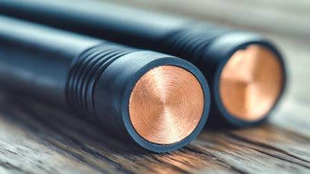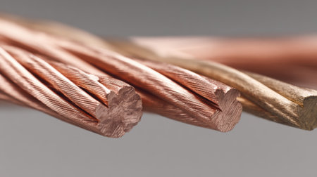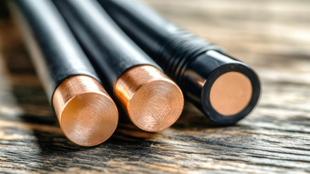 A detailed look at three power cables reveals the shiny copper ends and thick black insulation, highlighting their texture and material contrasts on a rustic surface.