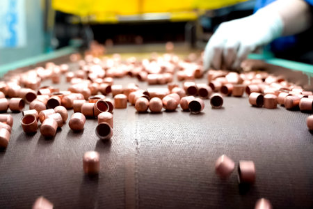 Blank cylinders for cartridge case manufacturing, ammunition production conveyor.