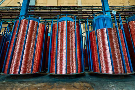 Copper wire reels in cable factory close up