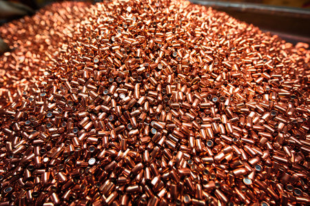 Large pile of empty cartridge cases, components for assembling cartridges.