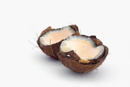 rotten coconut close up on white background