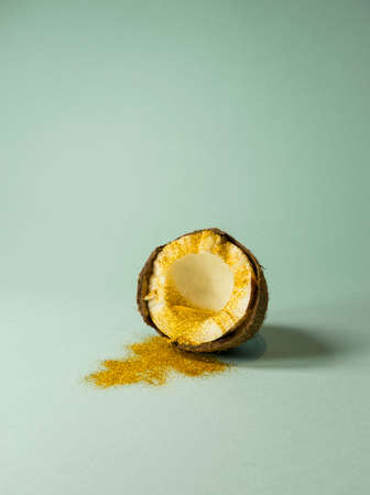 Golden tinsel spilling from cracked half coconut on trendy pastel aquamarine background. Party idea. Minimal summer fun concept.