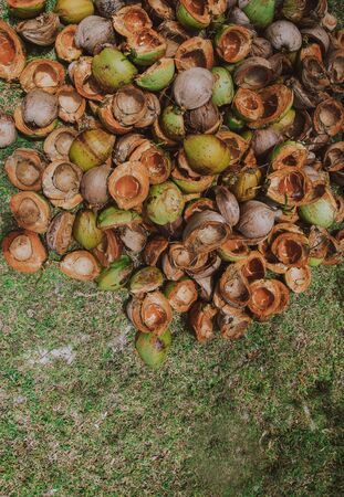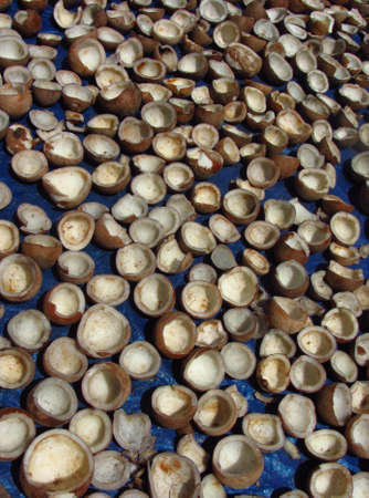 Many coconuts cut into half lying on the sun