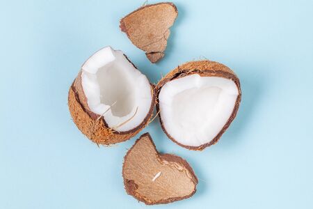 Whole and halfs of coconuts on a blue background. Top view and copy space.