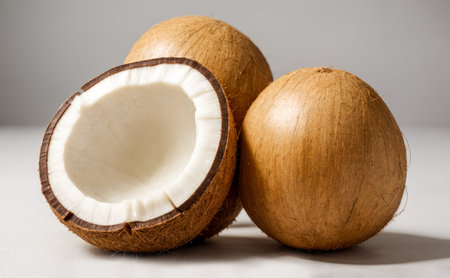 Fresh coconut split in half, creamy interior exposed against a bright white backdrop for tropical nutrition themes