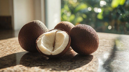 A close-up view of fresh tropical fruits on a kitchen countertop, highlighting their natural textures and colors under soft sunlight. Perfect for culinary and health themes.