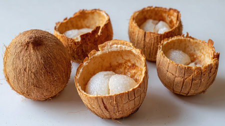 AI Generated. Two coconuts sit side by side on a white surface One is split in half