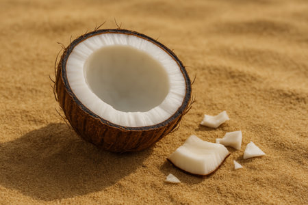 A freshly cut coconut half surrounded by coconut pieces on a sandy surface