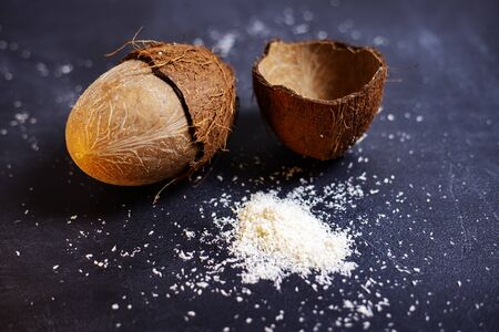 Dry coconut on a black background with artistic lighting