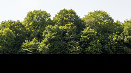 A dense canopy of lush green trees against a bright white sky. Clear details and vibrant colors enhance visual...