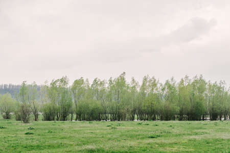 Fresh meadow with forest under cloudy sky.