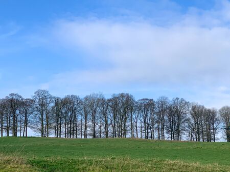 Trees without leaves on a farm land against a blue sky. Winter landscape scene