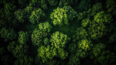 A stunning aerial view of a lush green forest canopy reveals vibrant foliage and a serene natural environment. Perfect for nature enthusiasts and eco themes.