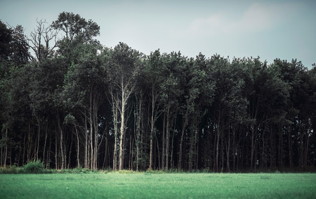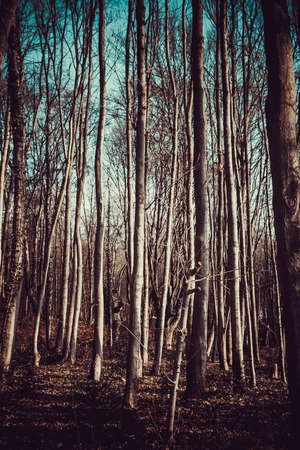 landscape of young grey forest with green trees, nature series
