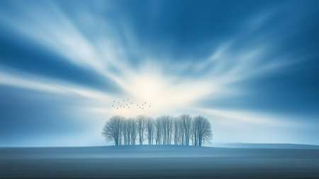 A serene landscape at dawn with a cluster of trees under a dramatic sky illuminated by soft sunlight and flying birds