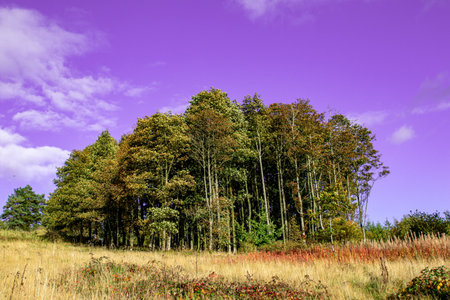 Autumn landscape with pine forest on the hillside and purple sky