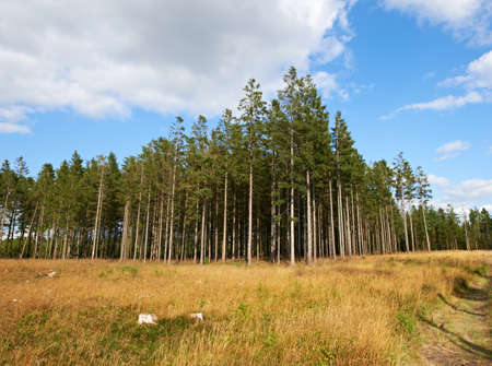 pines in deep forest and blue sky with clouds