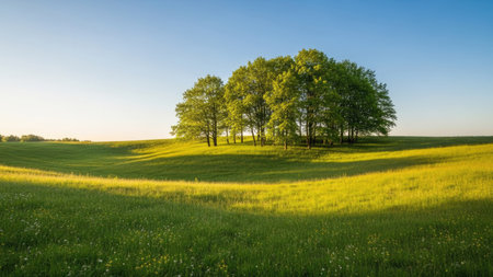 Green meadow with trees and blue sky at sunset. Nature composition.