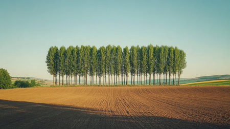 A row of tall trees at the edge of farmland