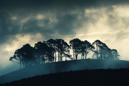 A picturesque scene featuring a row of lush green trees under a dramatic sky, embodying tranquility and showcasing the beauty of natural landscapes.