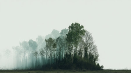 A stunning foggy forest landscape featuring a cluster of lush green trees emerging from a misty atmosphere, ideal for nature enthusiasts and outdoor settings.