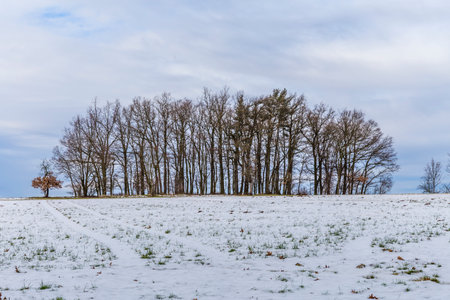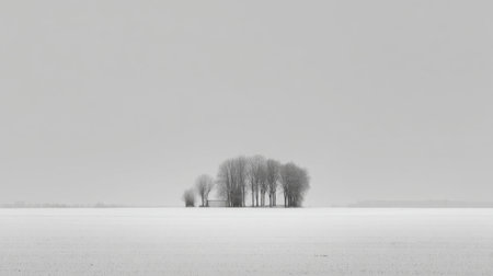 A tranquil winter scene showcases a group of bare trees standing isolated on a vast snowy field under a soft gray sky, evoking serenity.