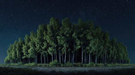 A panoramic wide view of Ash forest growing closely together under a clear night sky starlight illuminating leaves soft shadows calm natural atmosphere ultra realistic photography cinematic wide composition lifelike natural scene