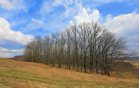 grove on a slope in early spring under a blue sky with clouds