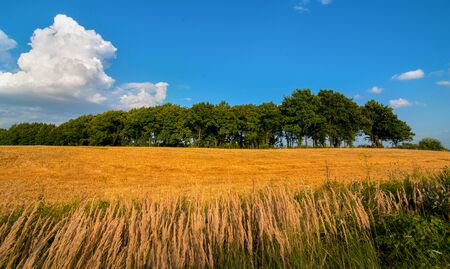 Beautiful european landscape. Spring field with green grass, trees and cloudy blue sky.